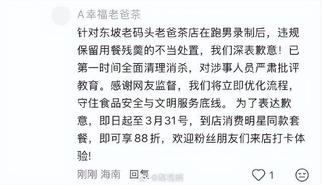 面对汹涌批评,27日上午,餐厅称针到在跑男录制后,违规保留用餐残羹的不当处置,表示歉意,已第一时间收拾干净并做消杀处理,对涉事人员进行了严肃批评教育。商家对此公开致歉。